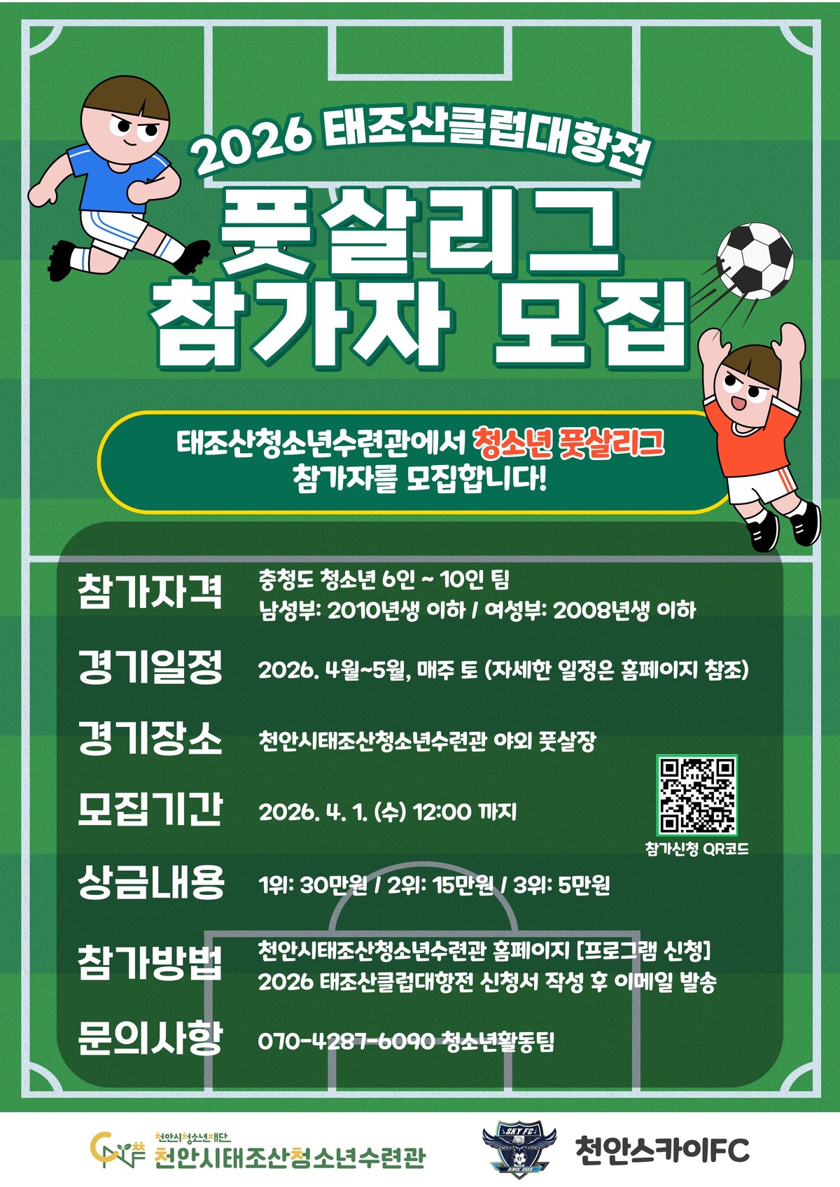 [충청중심뉴스] 천안시청소년재단 산하 천안시태조산청소년수련관은 청소년의 건강한 여가 활동과 스포츠 참여 기회를 확대하기 위해 ‘2026 태조산 클럽대항전 풋살리그’ 참가팀을 모집한다고 20일 밝혔다.