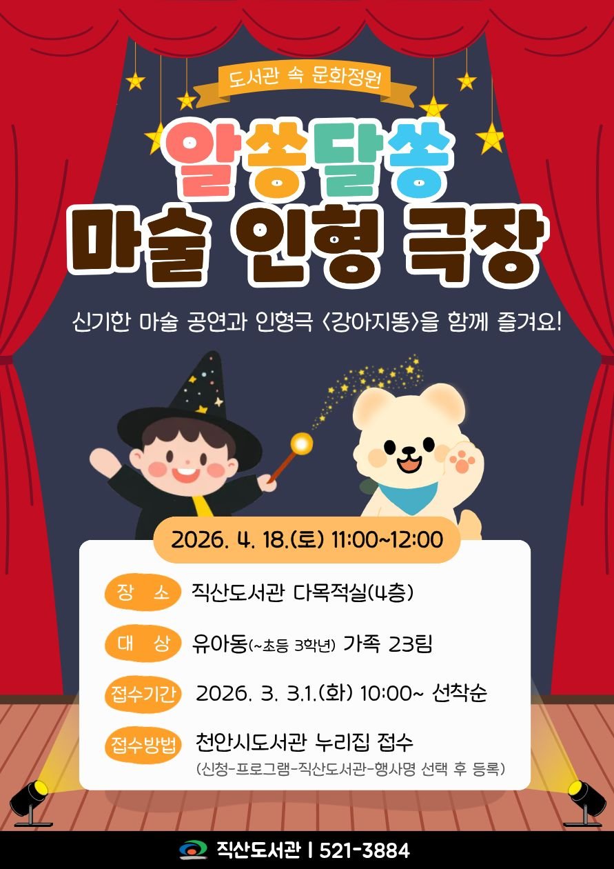 이충미 직산도서관장은 “신비로운 마술이 주는 즐거움과 인형극이 전하는 깊은 감동이 지역주민들에게 특별한 선물이 되길 바란다”고 말했다.