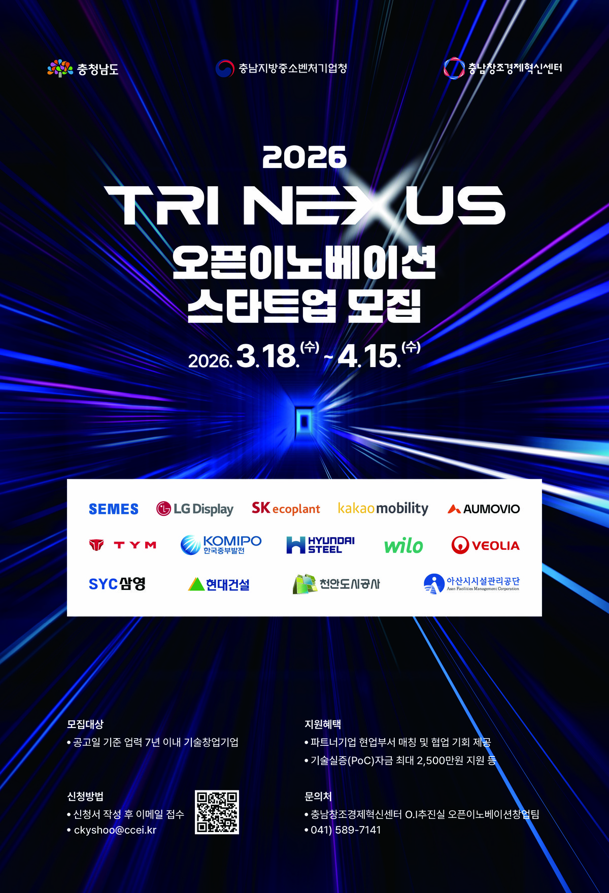 [충청중심뉴스] 충남창조경제혁신센터는 대 중견기업과 스타트업 간 오픈이노베이션을 통해 혁신기술의 산업 적용과 사업화를 지원하는 '2026 Tri Nexus 오픈이노베이션'프로그램에 참여할 스타트업을 오는 4월 15일까지 모집한다고 밝혔다.