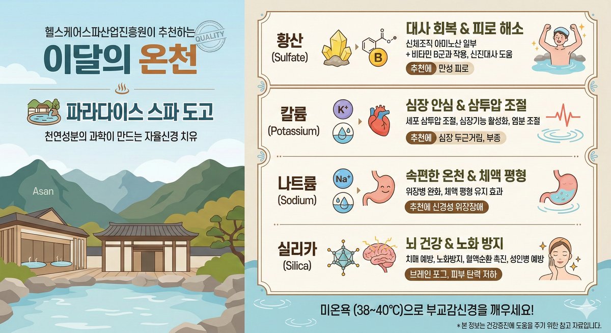 한편 파라다이스 스파 도고는 이번 이달의 온천 선정을 기념해 진흥원 권장 입욕법 안내 및 성분별 효능을 담은 인포그래픽을 홈페이지에 게재하고 방문객들에게 과학적인 온천 요법을 전파할 예정이다.