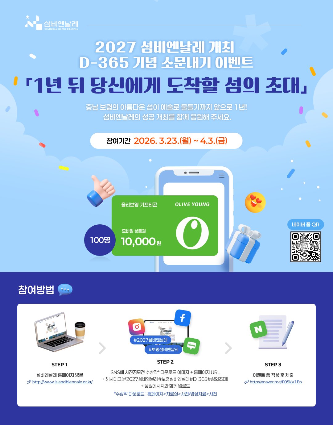 [충청중심뉴스] 섬비엔날레조직위원회는 3월 23일부터 4월 3일까지 약 2주간 섬비엔날레 개최 D-365일을 맞아 대국민 온라인 참여 이벤트를 진행한다고 밝혔다.