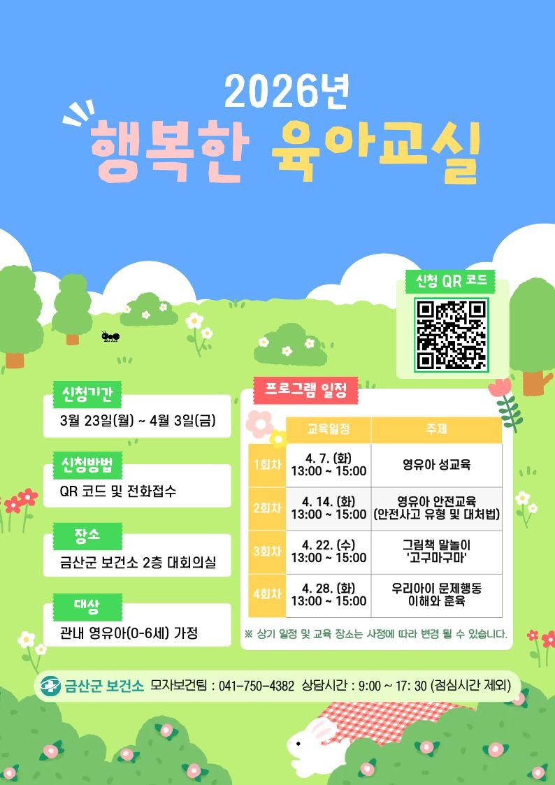 [충청중심뉴스] 금산군보건소는 관내 예비 부모 및 6세 이하 자녀를 둔 부모를 대상으로 4월 7일부터 28일까지 행복한 육아교실을 개최한다.