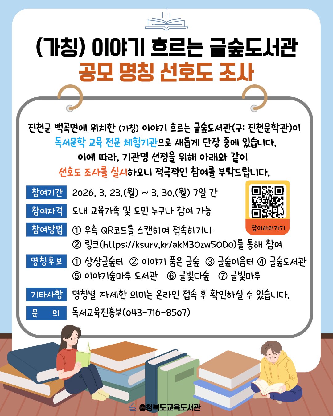 [충청중심뉴스] 충청북도교육청 직속기관 교육도서관은 진천군 백곡면에 위치한진천문학관 부지에 조성 중인이야기 흐르는 글숲도서관의 기관명을 정하기 위해 교육가족과 도민을 대상으로 명칭 선호도 조사를 실시한다.