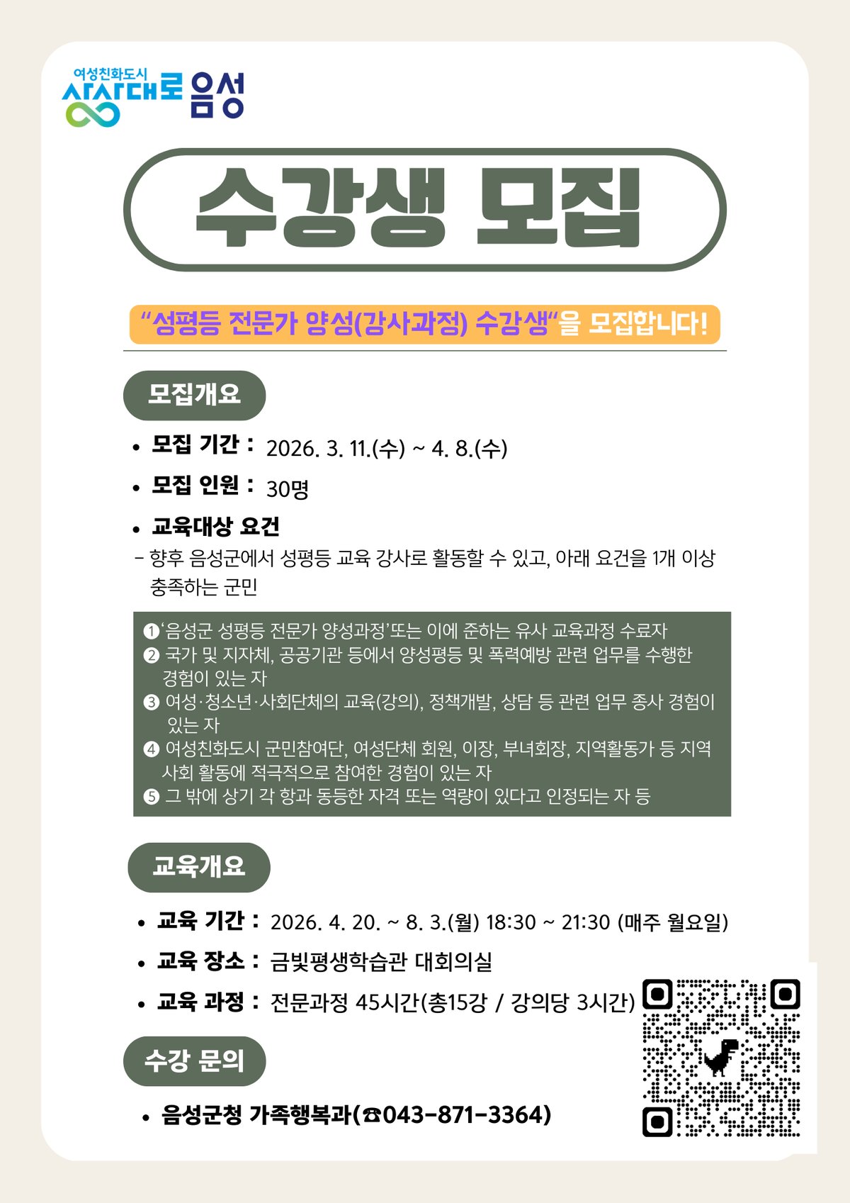 [충청중심뉴스] 음성군은 지역 맞춤형 전문 인력풀을 구축하고 지역 성평등 전문가 양성을 위해‘2026년 음성군 성평등 전문가 양성 강사 과정’ 수강생 30명을 모집한다고 23일 밝혔다.