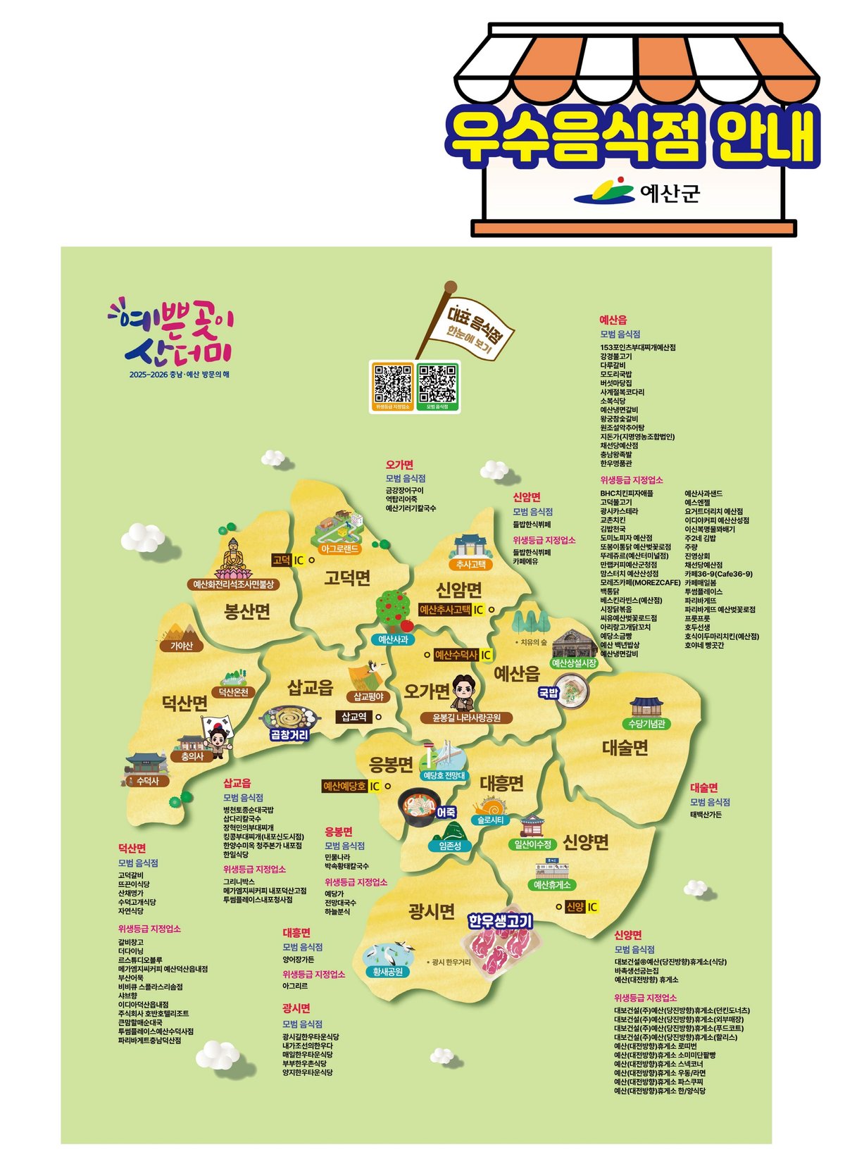 [충청중심뉴스] 예산군은 예산을 방문하는 관광객과 군민이 안심하고 음식점을 이용할 수 있도록 주요 관광지에 우수음식점 안내판을 설치했다고 밝혔다.