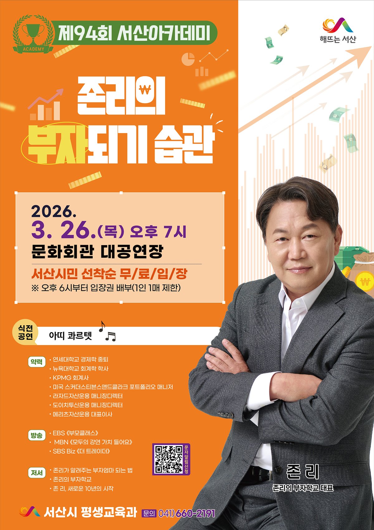 [충청중심뉴스] 충남 서산시는 ‘존리의 부자학교’존 리 대표를 초청해 제94회 서산아카데미를 개최한다고 밝혔다.