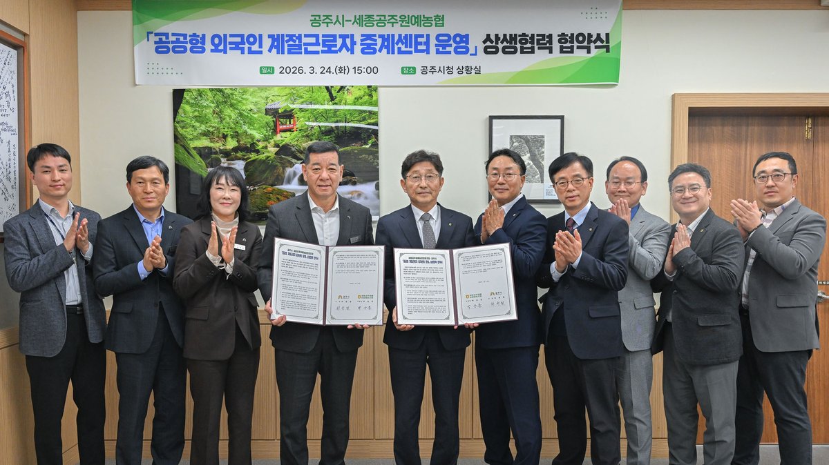 [충청중심뉴스] 공주시는 지난 24일 시청 상황실에서 세종공주원예농협과 농촌 일손 부족 해소를 위한 ‘공공형 외국인 계절근로자 중개센터 운영 업무협약’을 체결했다.