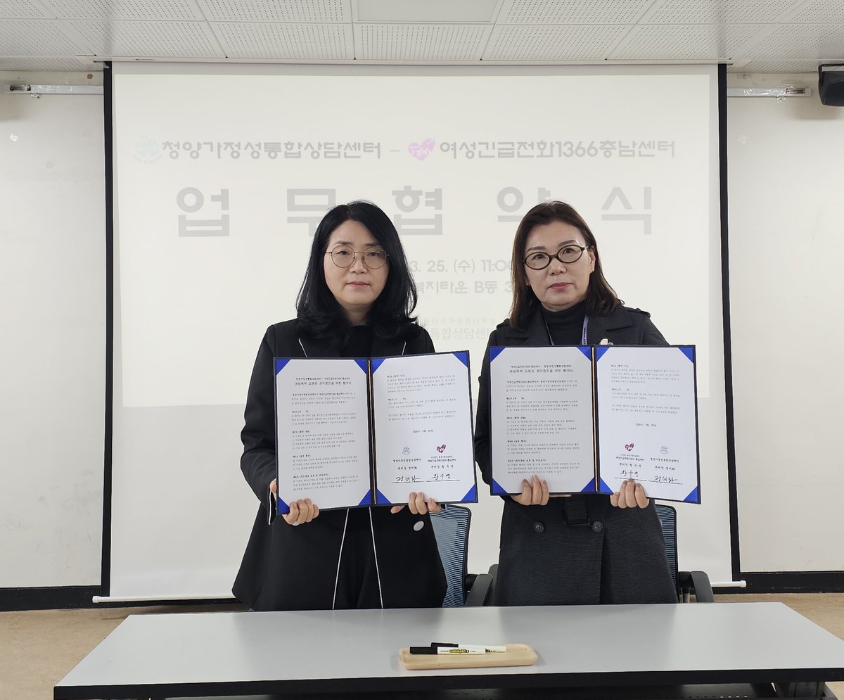 [충청중심뉴스] 청양가정성통합상담센터와 여성긴급전화 1366 충남센터가 지역 내 여성 폭력을 예방하고 피해자 지원 체계를 강화하기 위해 업무협약을 체결했다.