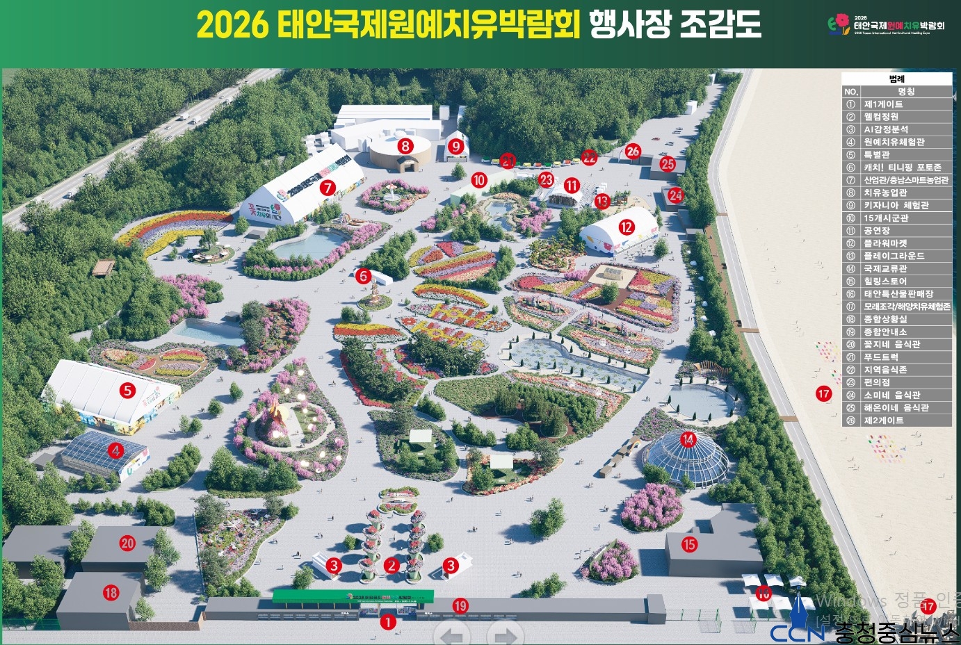충청남도와 태안군이 주최하는 2026태안국제원예치유박람회는 4월 25일부터 5월 24일까지 태안군 안면도 꽃지해안공원 일원에서 열리며 세계 최초 '원예치유'주제를 기반으로 전시와 체험이 결합된 참여형 콘텐츠를 중심으로 구성된다.