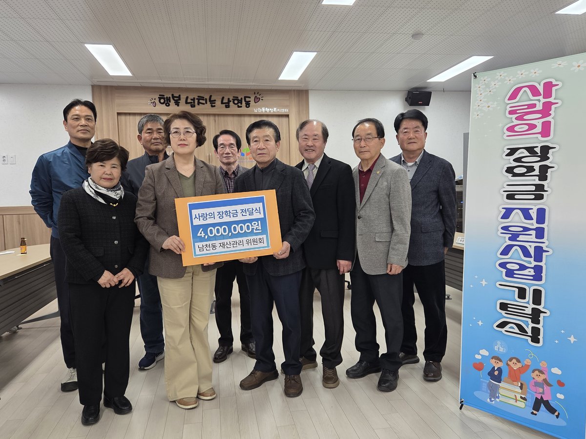 남천동재산관리위원회는 지난 26일 남현동행정복지센터를 방문해 지역 내 어려운 환경 속에서도 학업에 매진하고 있는 학생들을 위해 써달라며 장학금 400만원을 전달했다.