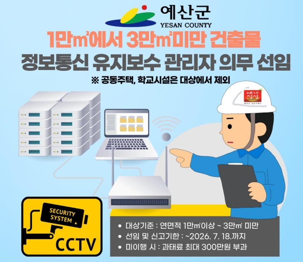 [충청중심뉴스] 예산군은 대형 건축물의 정보통신설비 장애를 예방하고 안정적인 운영을 도모하기 위해 ‘정보통신설비 유지보수 관리자 선임제’를 시행하고 대상 확대에 나선다.