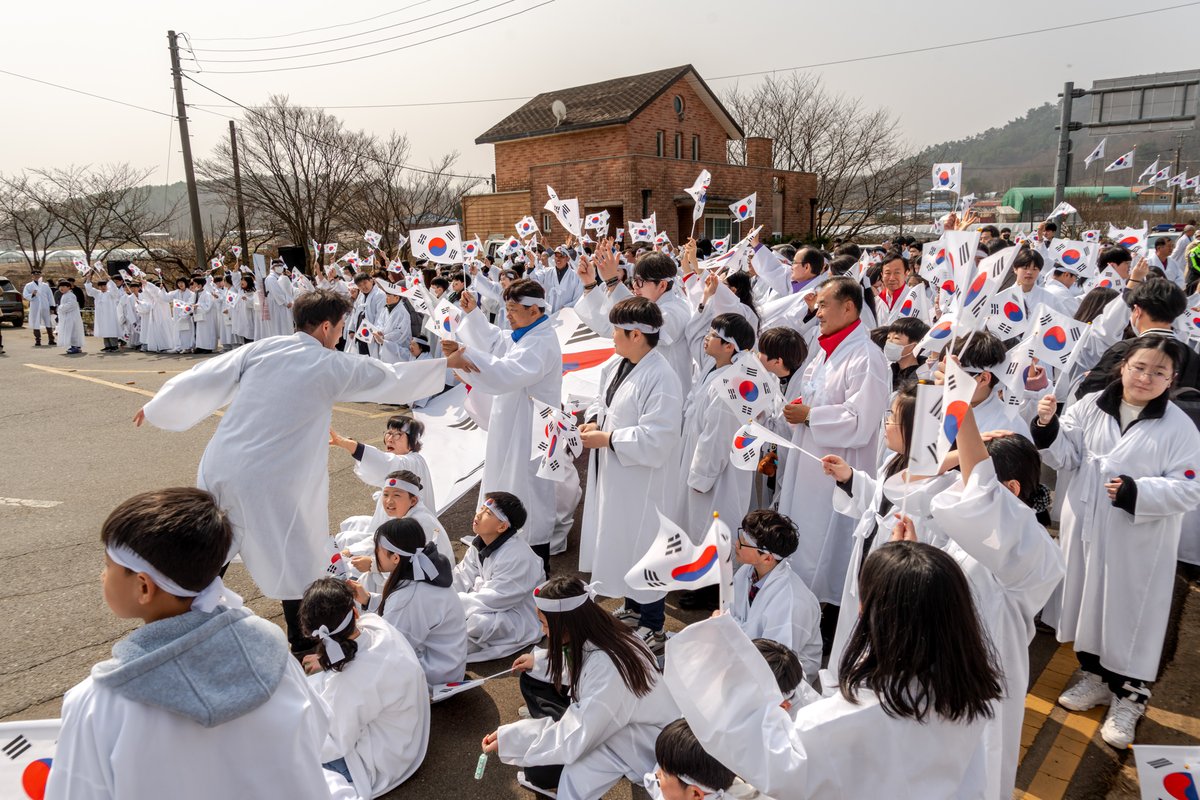 이어 열린 재연 행사에서는 학생들과 주민들이 대형 태극기를 앞세우고 마산면 3.29카페 광장에서 기념비까지 약 1km 구간을 행진하며 “대한독립만세”를 외쳐 현장의 의미를 더했다.