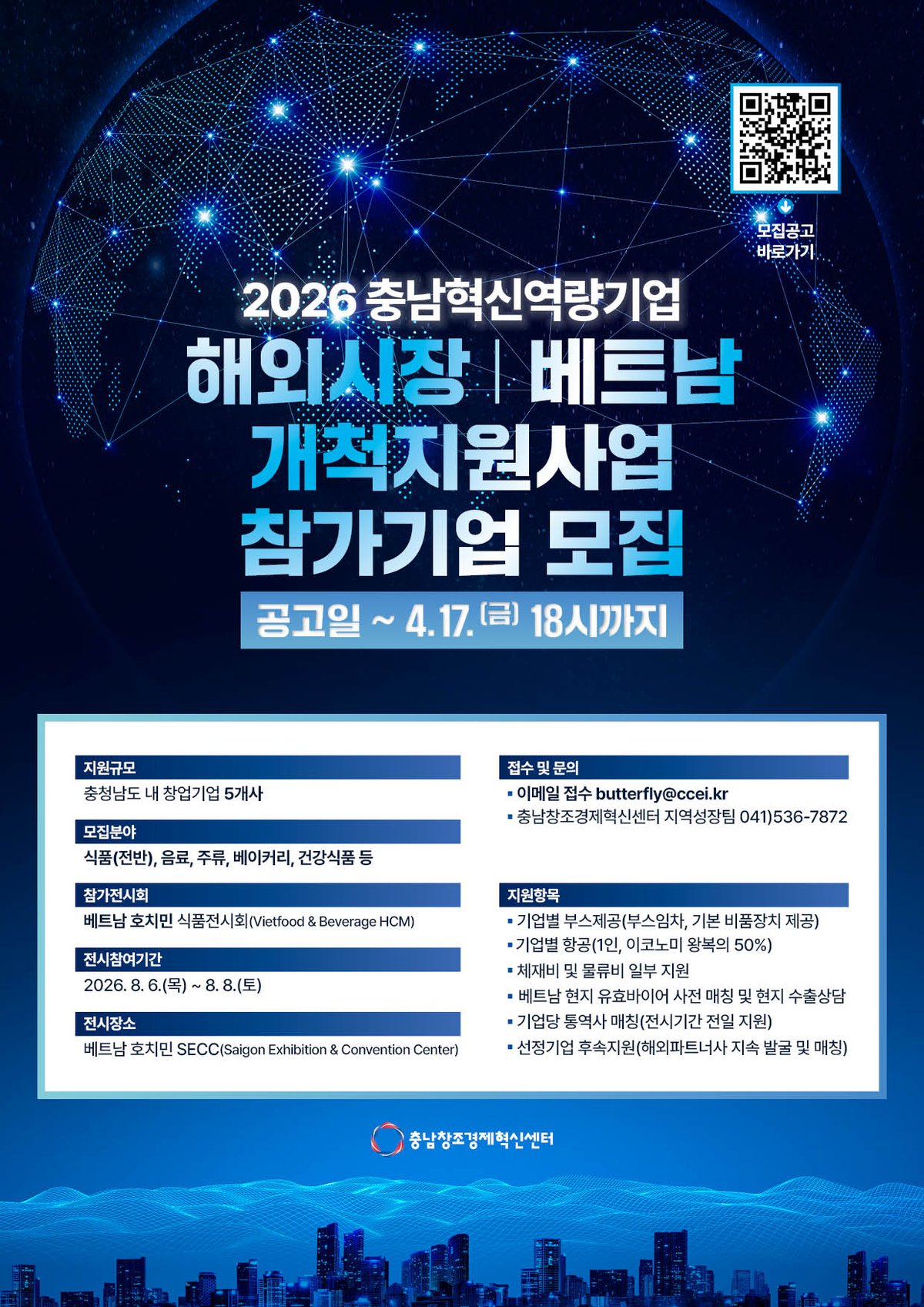 [충청중심뉴스] 충남창조경제혁신센터는 2026년 충남 혁신역량기업 해외시장개척 지원사업에 참여할 충남도내 창업기업 5개사를 오는 4월 17일까지 모집한다고 밝혔다.