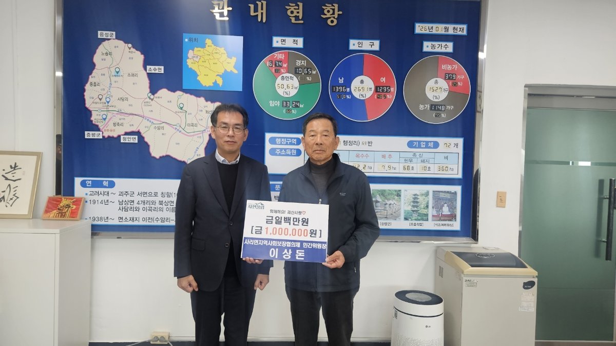 [충청중심뉴스] 충북 괴산군 사리면 지역사회보장협의체 이상돈 민간위원장이 30일 사리면 지역사회보장협의체에 100만원을 기탁해 지역사회에 깊은 감동을 전하고 있다.