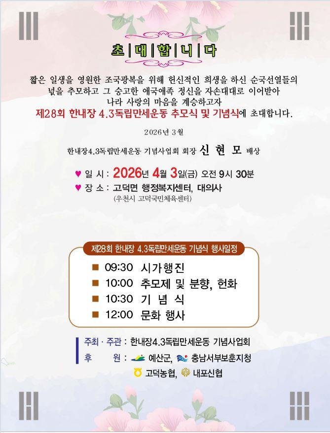 [충청중심뉴스] 예산군은 4월 3일 고덕면 한내장터 일원에서 ‘제28회 한내장 4 3 독립만세운동 기념행사’를 개최한다고 밝혔다.