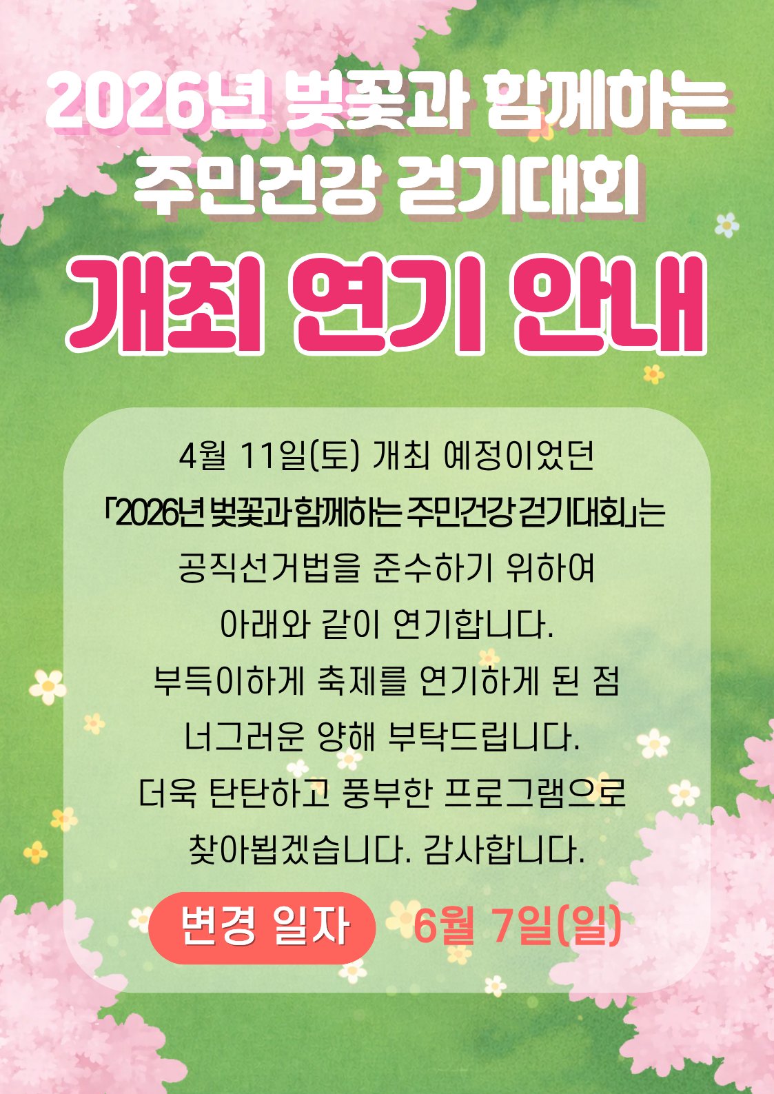 [충청중심뉴스] 홍성군 광천읍과 광천읍주민자치회는 당초 11일 광천읍 하상주차장에서 개최할 예정이었던 ‘2026년 벚꽃과 함께하는 주민건강 걷기대회’행사를 6월 7일로 연기한다고 밝혔다.
