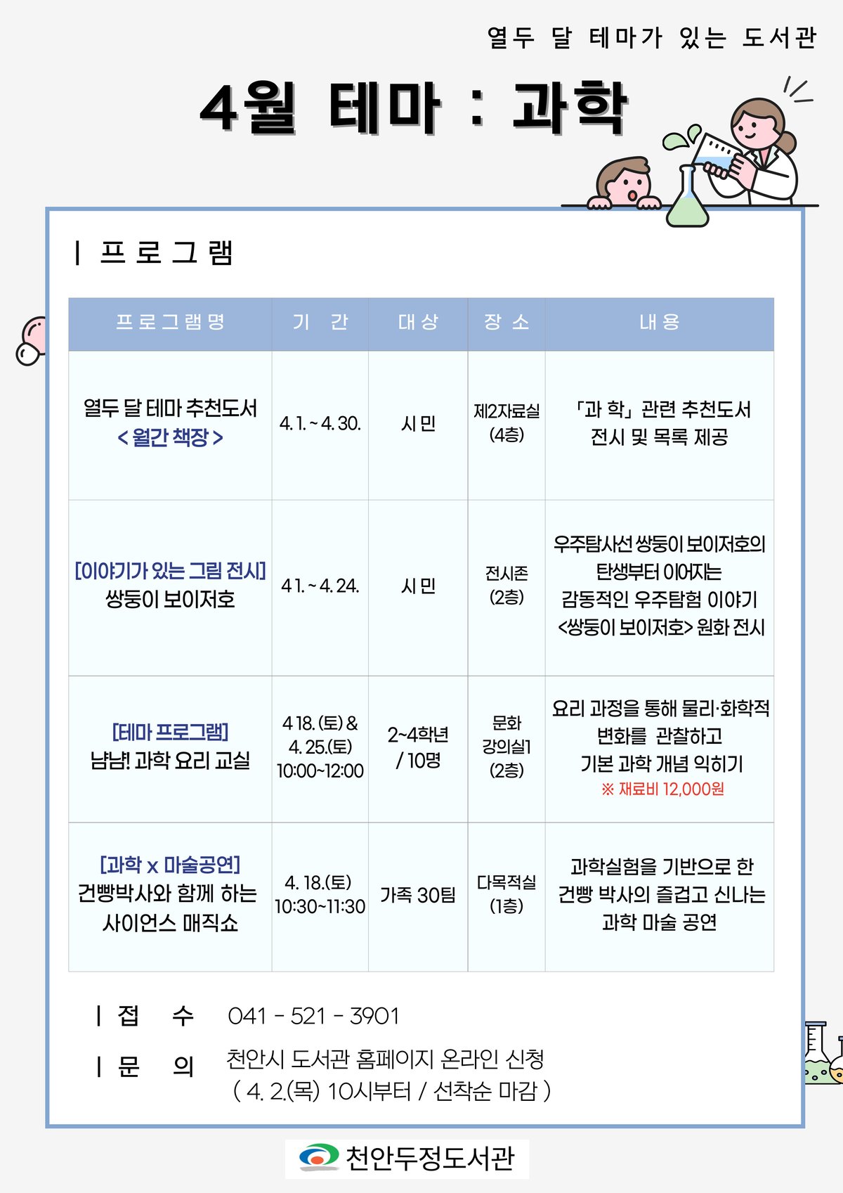 [충청중심뉴스] 천안시 두정도서관은 4월한 달간 ‘ 과학’을 주제로 도서관을 운영한다고 1일 밝혔다.