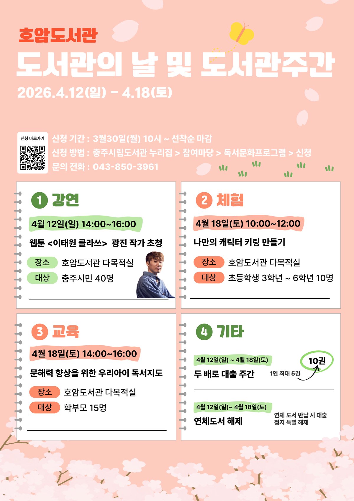 [충청중심뉴스] 충주시 호암도서관은 제4회 ‘도서관의 날’과 제62회 ‘도서관주간’을 맞아 4월 12일부터 18일까지 7일간 다채로운 독서문화 행사를 운영한다고 2일 밝혔다.