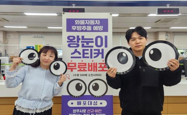 [충청중심뉴스] 청주시 차량등록사업소가 화물자동차 교통사고 예방을 위해 ‘왕눈이 스티커’를 제작 배포하고 있다.
