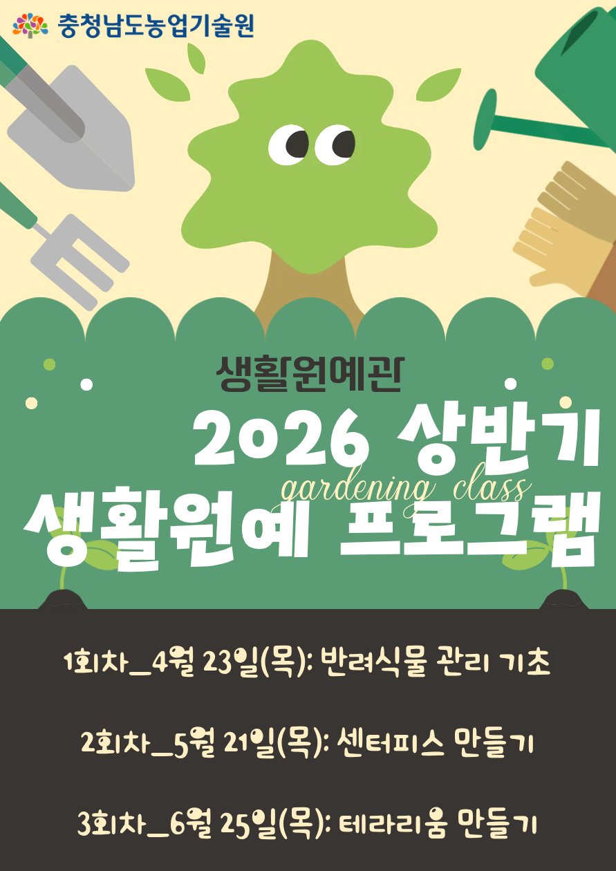[충청중심뉴스] 충남도 농업기술원은 도민의 생활 속 식물문화 확산을 위해 ‘2026년 상반기 생활원예 프로그램’일반인 과정 참여자를 모집한다고 2일 밝혔다.