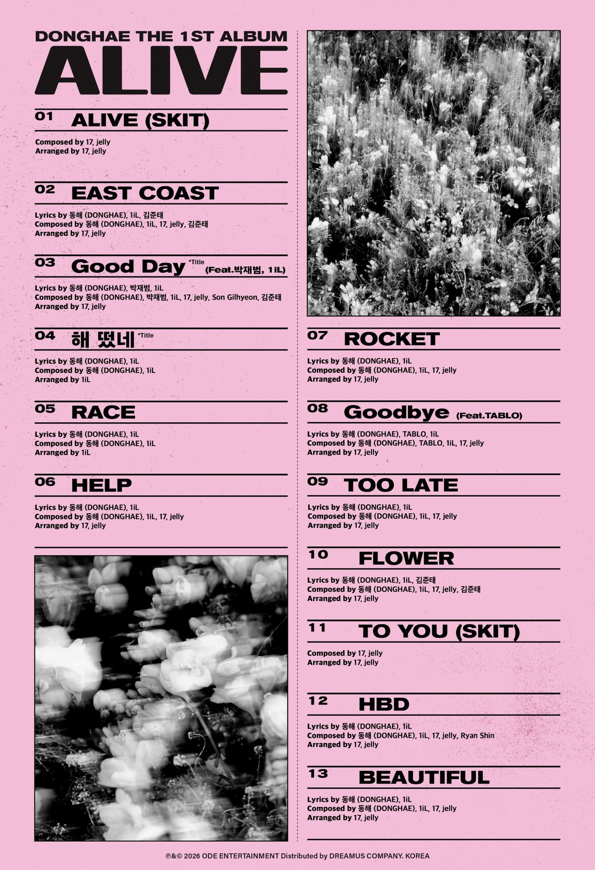 이외에도 'ROCKET', 'Goodbye', 'TOO LATE', 'FLOWER', 'TO YOU)', 'HBD', 'BEAUTIFUL'까지 총 13개의 트랙을 수록, 다채로운 장르를 통해 리스너들에게 듣는 재미를 선사할 예정이다.