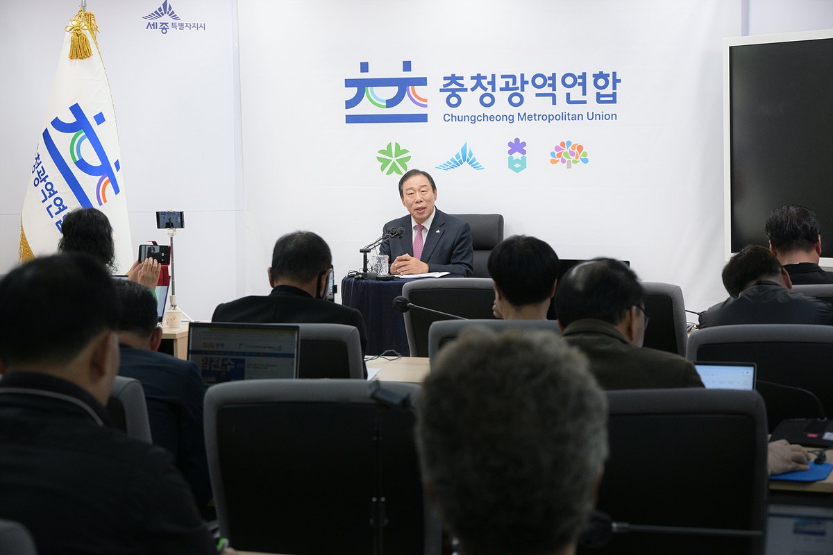최민호 연합장은 모두발언을 통해 "충청 4개 시도는 교통 환경 일자리 등 경계를 넘나드는 현안에 통합적으로 대응하는 데 한계가 있다"고 밝히며 "이러한 구조적 한계를 극복하기 위해 4개 시도가 공동으로 출자하고 함께 논의해서 결정하는 새로운 방식의 광역 협력체로 수도권 일극 체제 극복을 핵심 목표로 삼고 있다"고 충청광역연합의 출범 배경을 설명했다.