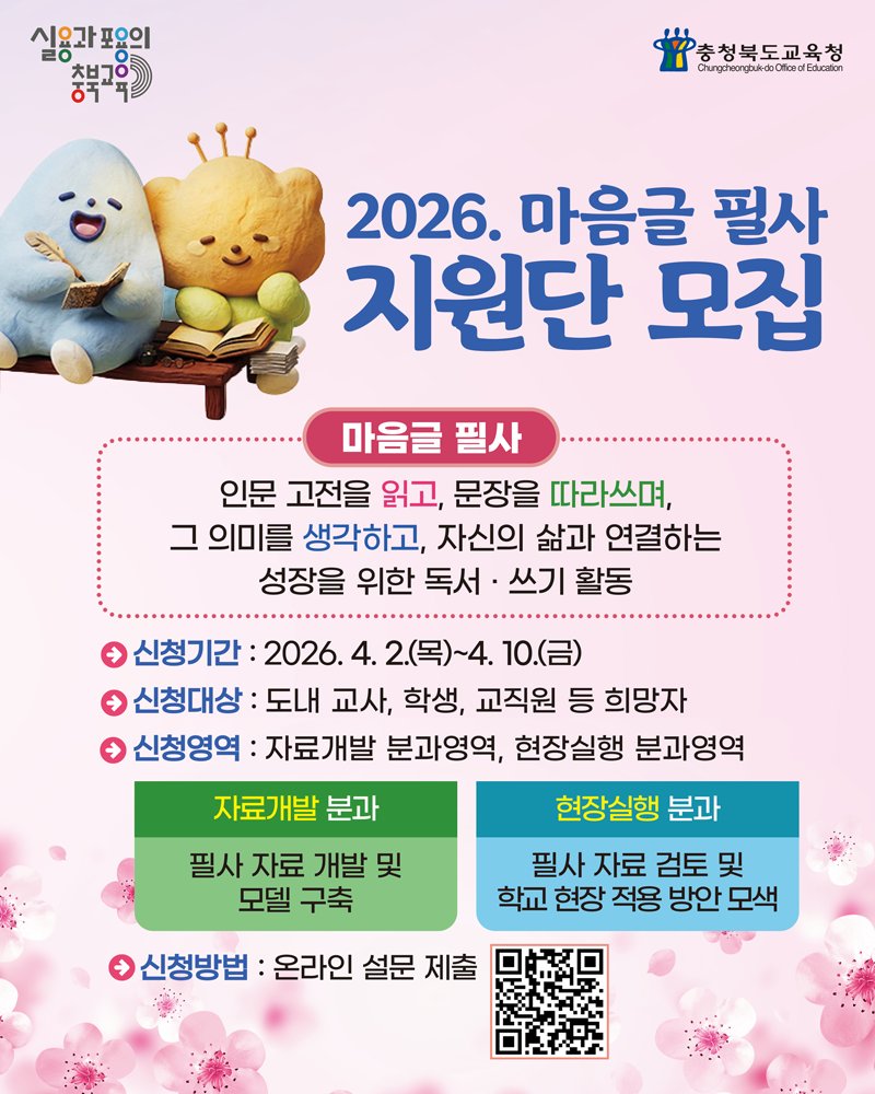 [충청중심뉴스] 충청북도교육청은 2일부터 10일까지 ‘2026. 마음글 필사 지원단’을 모집한다고 밝혔다.