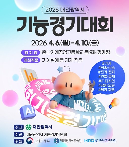 [충청중심뉴스] 대전시는 지역 숙련기술인들의 축제인 ‘2026년 대전광역시 기능경기대회’ 가 4월 6일부터 10일까지 5일간 충남기계공업고등학교 등 9개 경기장에서 개최된다고 밝혔다.