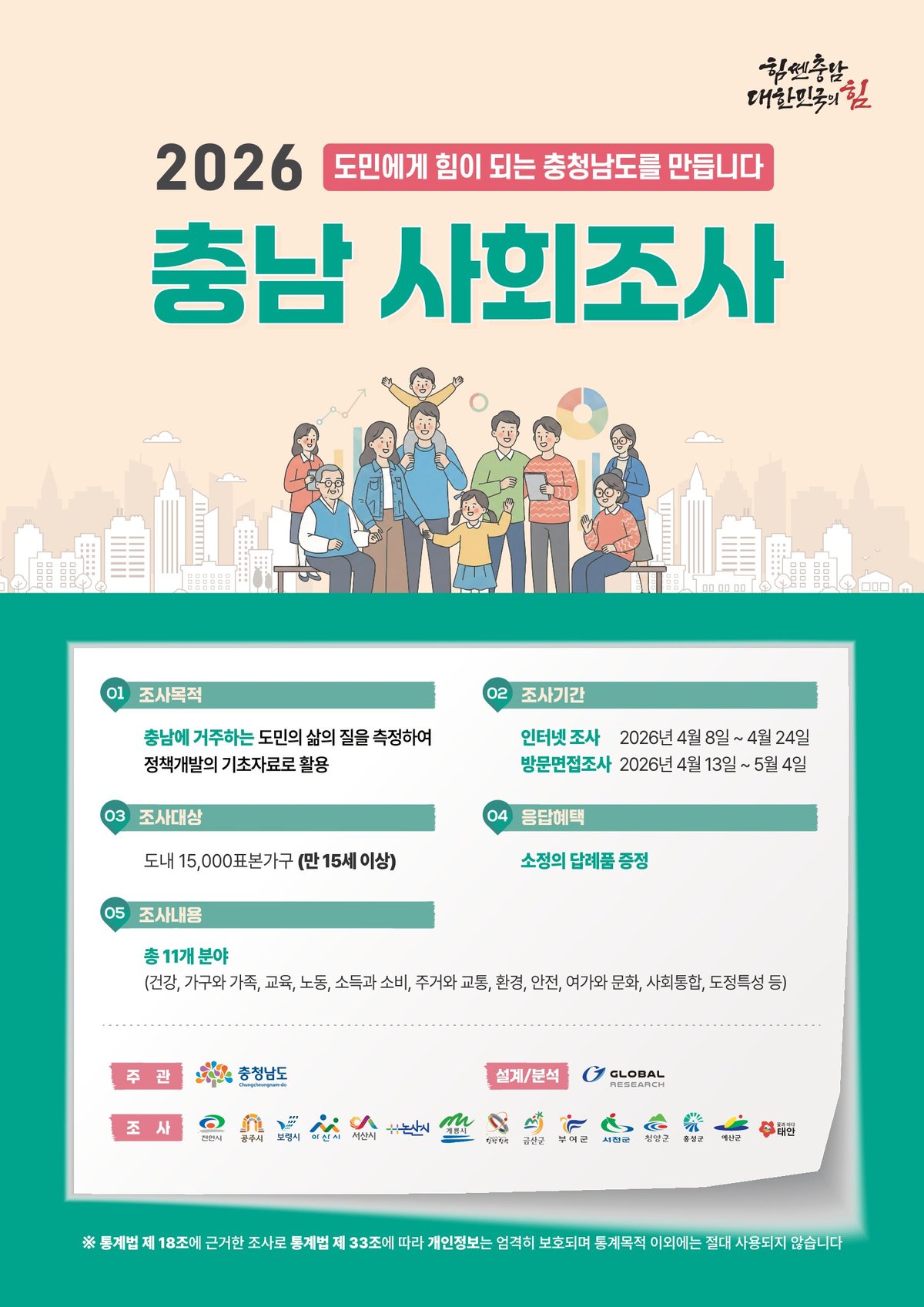 한편 조사 결과는 오는 12월 공표될 예정이며 향후 충남도민의 삶의 질 향상과 지역 발전을 위한 정책 수립의 기초자료로 활용될 계획이다.