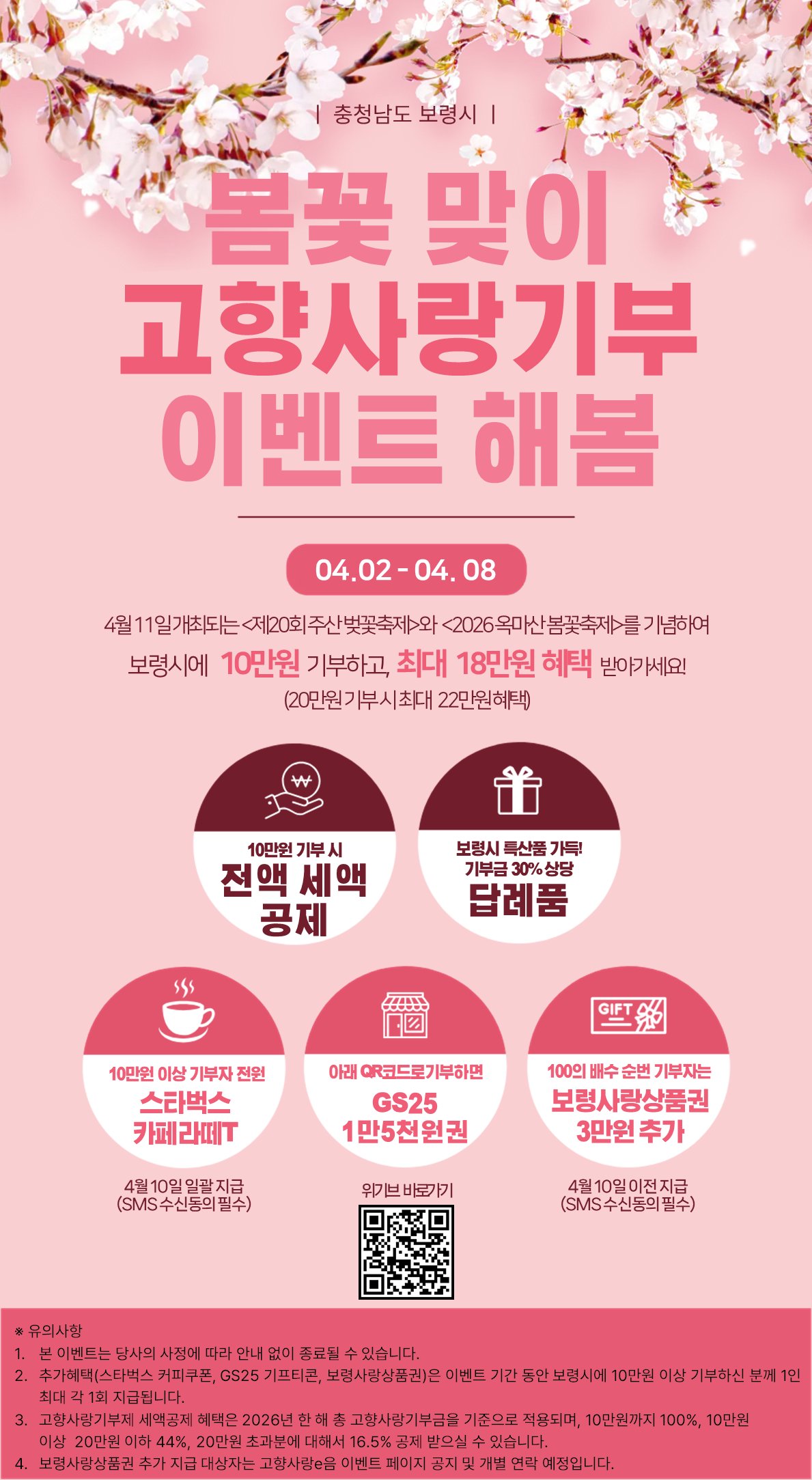 [충청중심뉴스] 보령시가 제20회 주산 벚꽃축제와 2026 옥마산 봄꽃축제를 맞아 오는 4월 8일까지 ‘봄꽃 맞이 고향사랑기부 이벤트 해봄’을 진행한다.