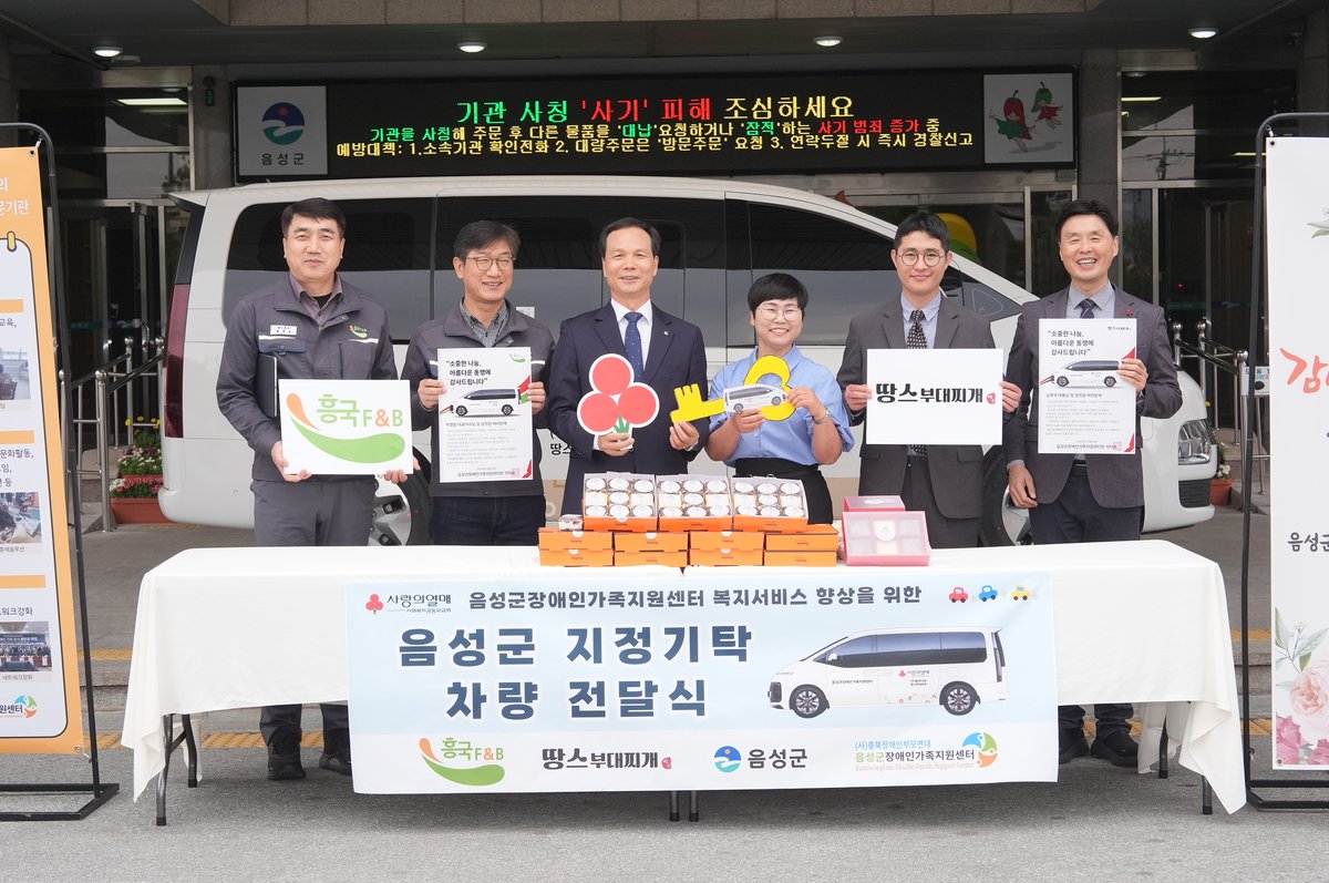 [충청중심뉴스] 음성군장애인가족지원센터 차량 전달식이 지난 6일 음성군청에서 열린 가운데 흥국에프엔비, 땅스푸드는 후원금 총 4000만원을 기탁하며 지역사회 내 소통과 이동지원 강화에 나섰다.