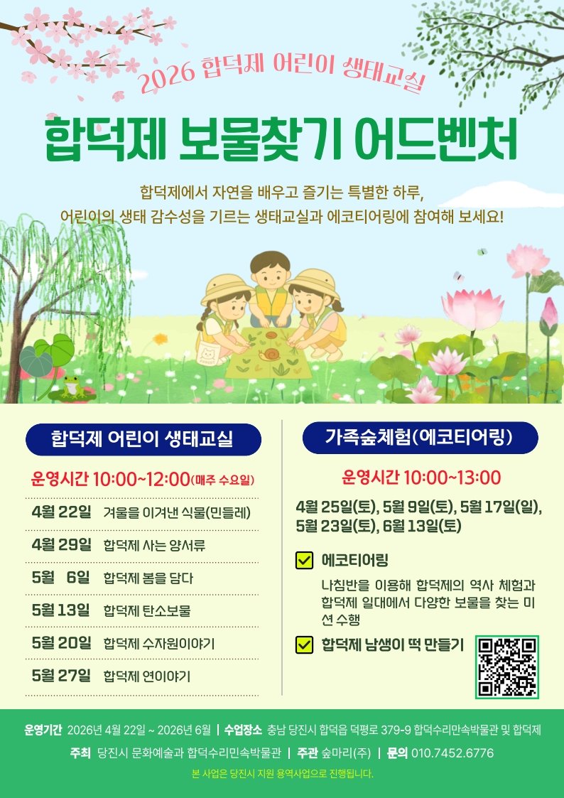 [충청중심뉴스] 당진시는 오는 6월까지 합덕제 야외 현장 및 합덕수리민속박물관에서 2026합덕제 어린이 생태교실 및 보물찾기 어드벤처 프로그램을 운영한다고 7일 밝혔다.