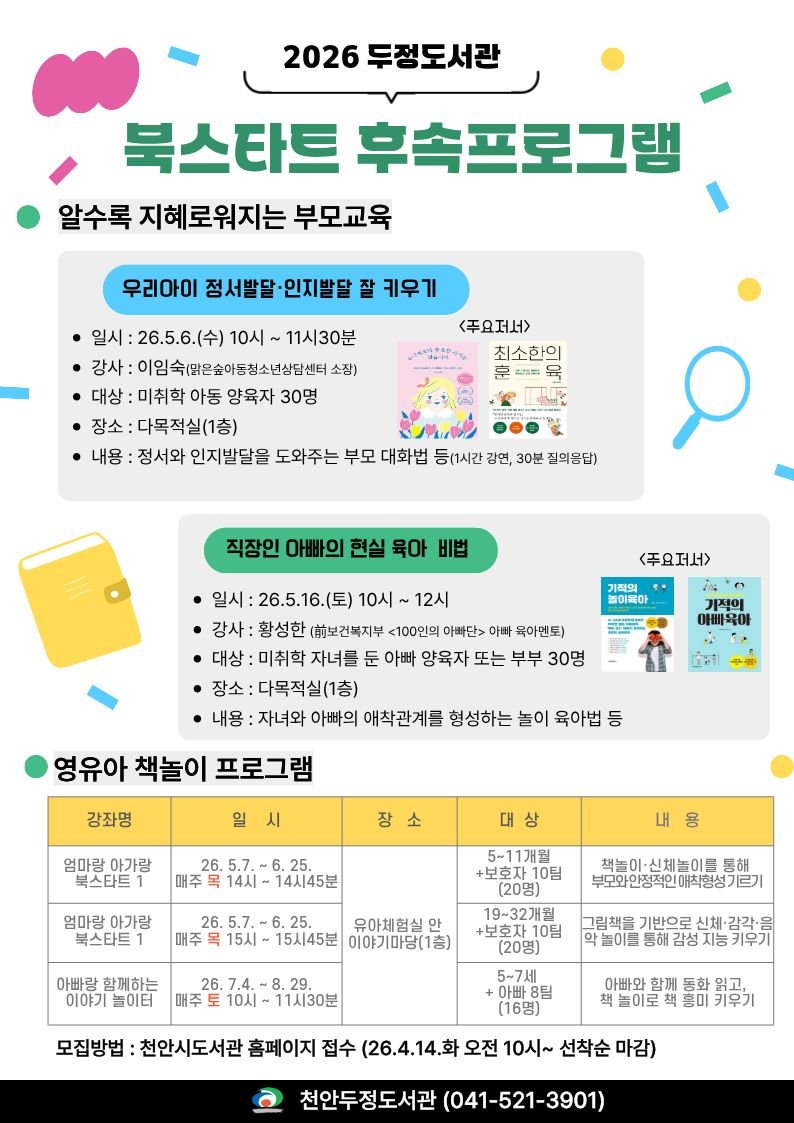 프로그램은 매월 토요일 직산도서관 유아자료실에서 운영되며 사전 신청없이 자유롭게 참여하면 된다.