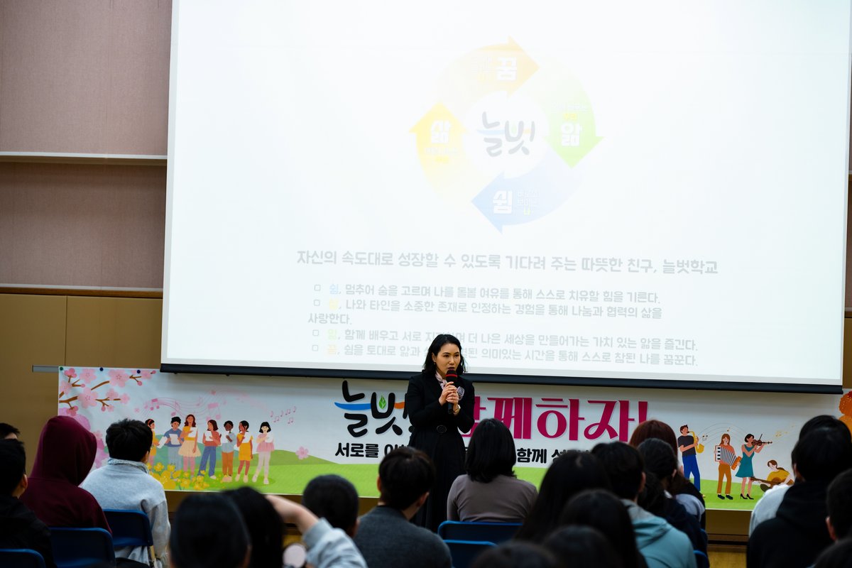 늘벗마중주간은 새로운 환경에 대한 부담을 줄이고 학생들이 학교 공동체에 자연스럽게 적응할 수 있도록 돕기 위한 교육과정으로 학교생활 이해를 위한 오리엔테이션, 학생-학생 학생-교사 간 관계 형성 교육과정 소개와 학교의 교육 방향 안내 등을 통해 서로를 이해하고 소통하는 시간을 마련했다.
