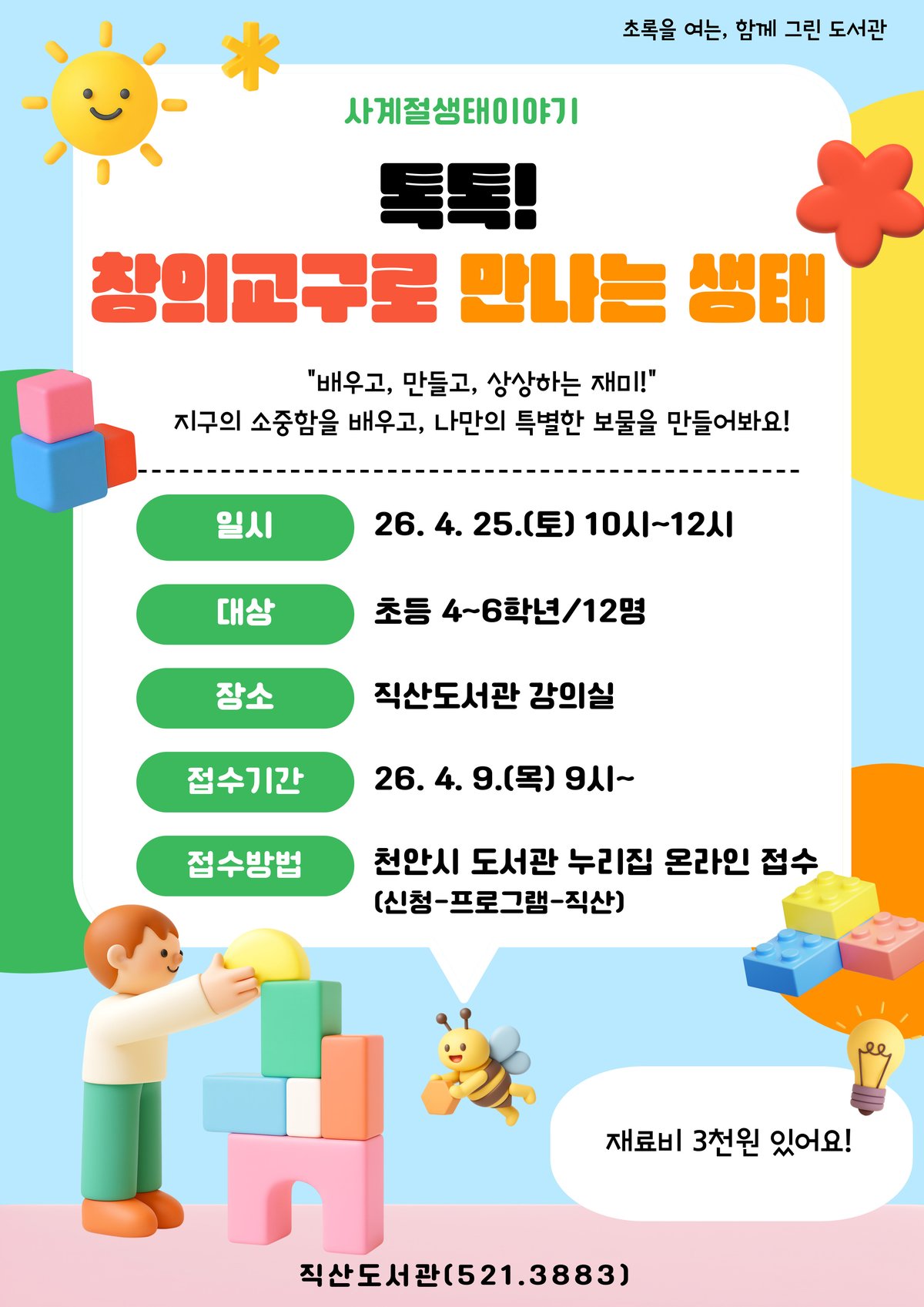 [충청중심뉴스] 천안시 직산도서관은 오는 25일 ‘톡톡 창의교구로 만나는 생태’를 운영한다고 8일 밝혔다.