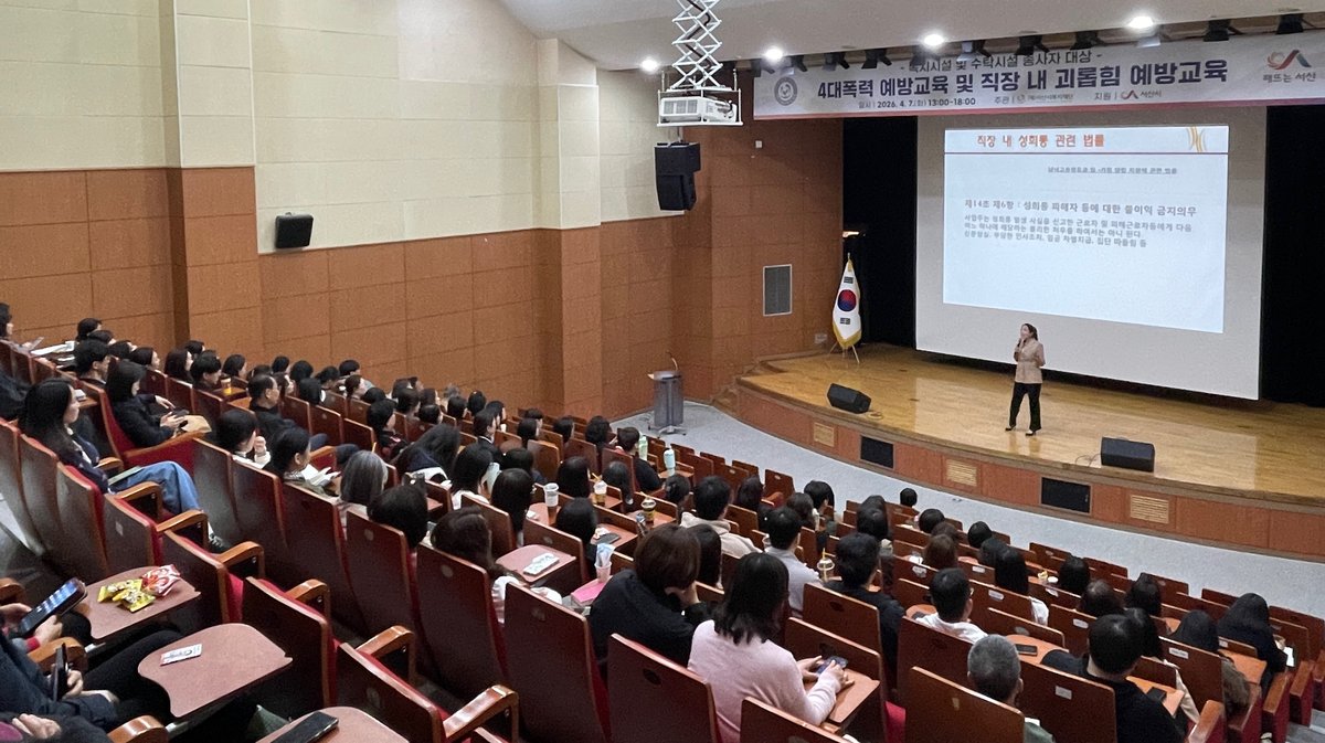 [충청중심뉴스] 서산시복지재단은 4월 7일 서산문화복지센터 청소년수련관 공연장에서 관내 사회복지 및 보육 종사자를 대상으로 ‘4대폭력 및 직장 내 괴롭힘 예방교육’을 실시했다.