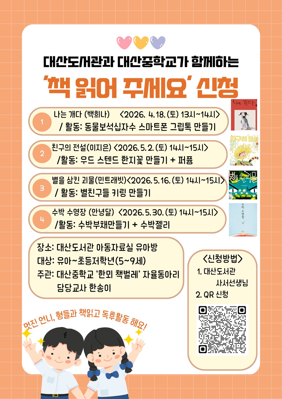 ‘책 읽어주세요’ 프로그램은 대산중학교 한뫼 책벌레 동아리 회원들의 자원봉사와 재능기부를 통해 자체 기획으로 운영되며 직접 선정한 그림책을 어린이들과 함께 읽고 주제와 관련된 다양한 테마 독후활동을 진행할 예정이다.
