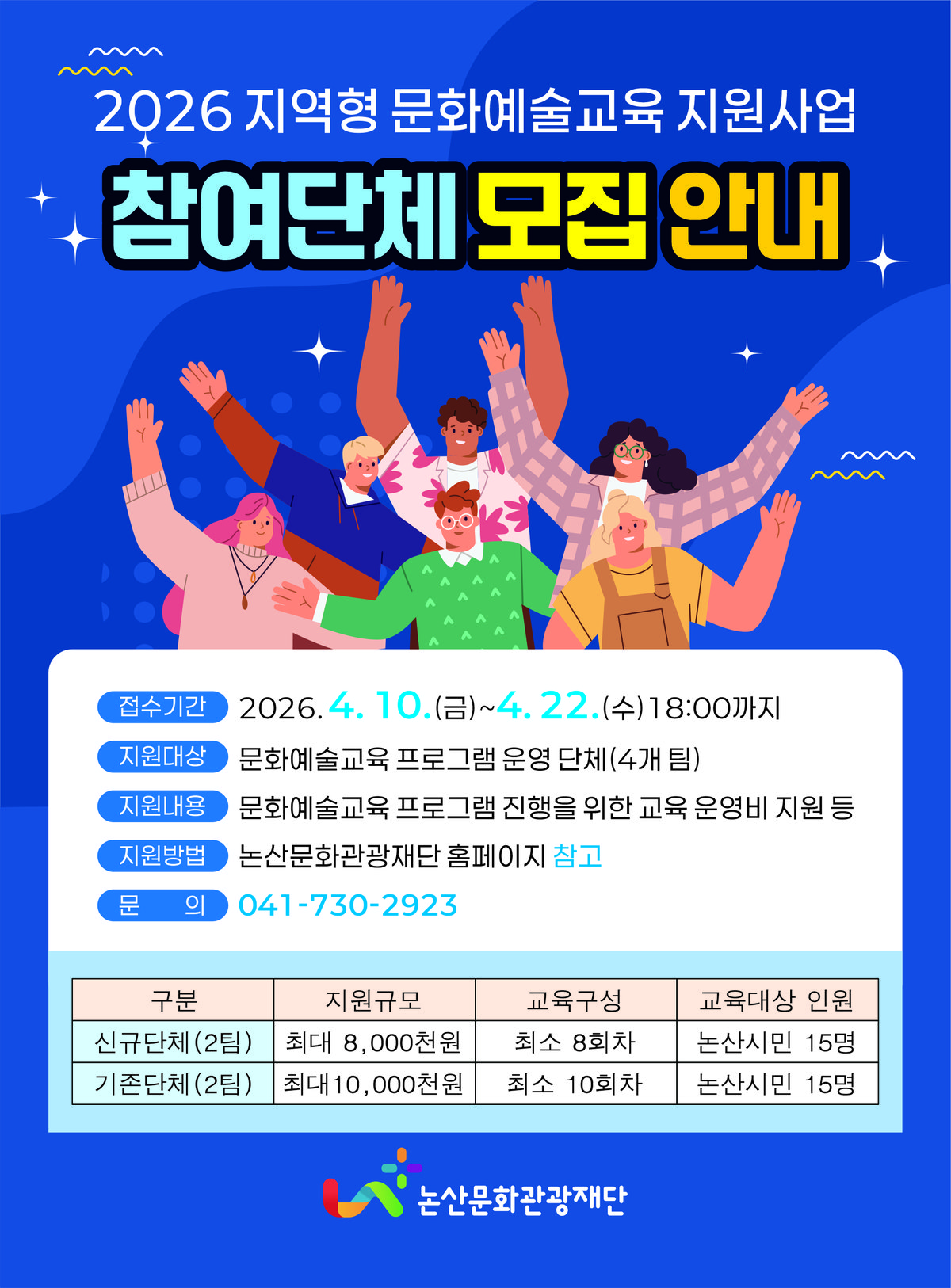 [충청중심뉴스] 논산문화관광재단은 지역 문화시설과 자원을 활용한 지속가능한 문화예술교육 기반 구축을 위해 ‘2026 지역형 문화예술교육 지원사업’ 운영단체를 공개 모집한다.