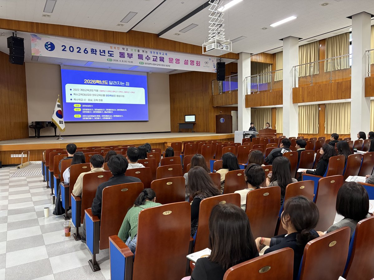 [충청중심뉴스] 대전동부교육지원청은 4월 8일 동부교육청 대강당에서 관내 유치원과 초 중학교 특수교사 150명을 대상으로 2026학년도 대전 동부 특수교육 운영 설명회를 개최했다고 밝혔다.