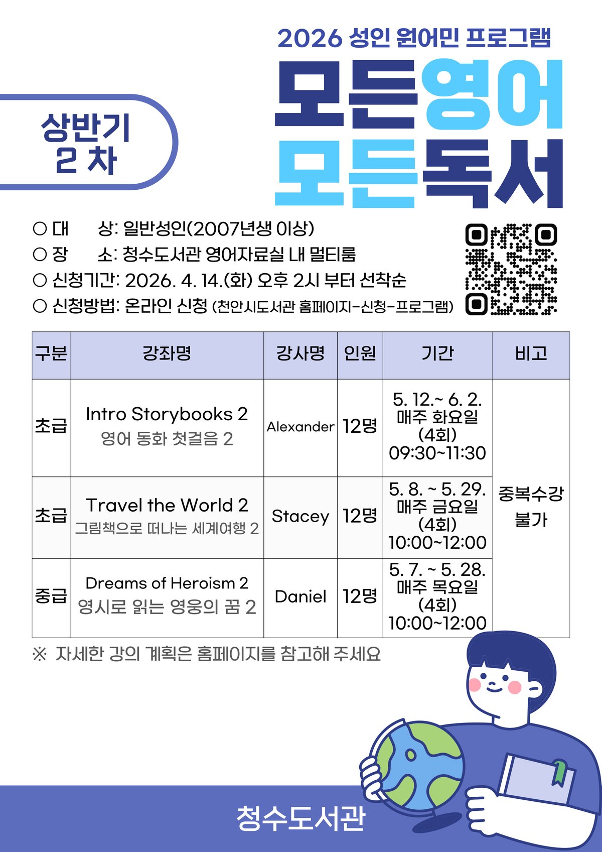 이재순 청수도서관장은 “원어민 강사와 함께하는 독서 프로그램을 통해 시민들이 영어에 대한 자신감을 얻고 도서관에서 유익한 자기계발의 시간을 갖길 바란다”고 말했다.