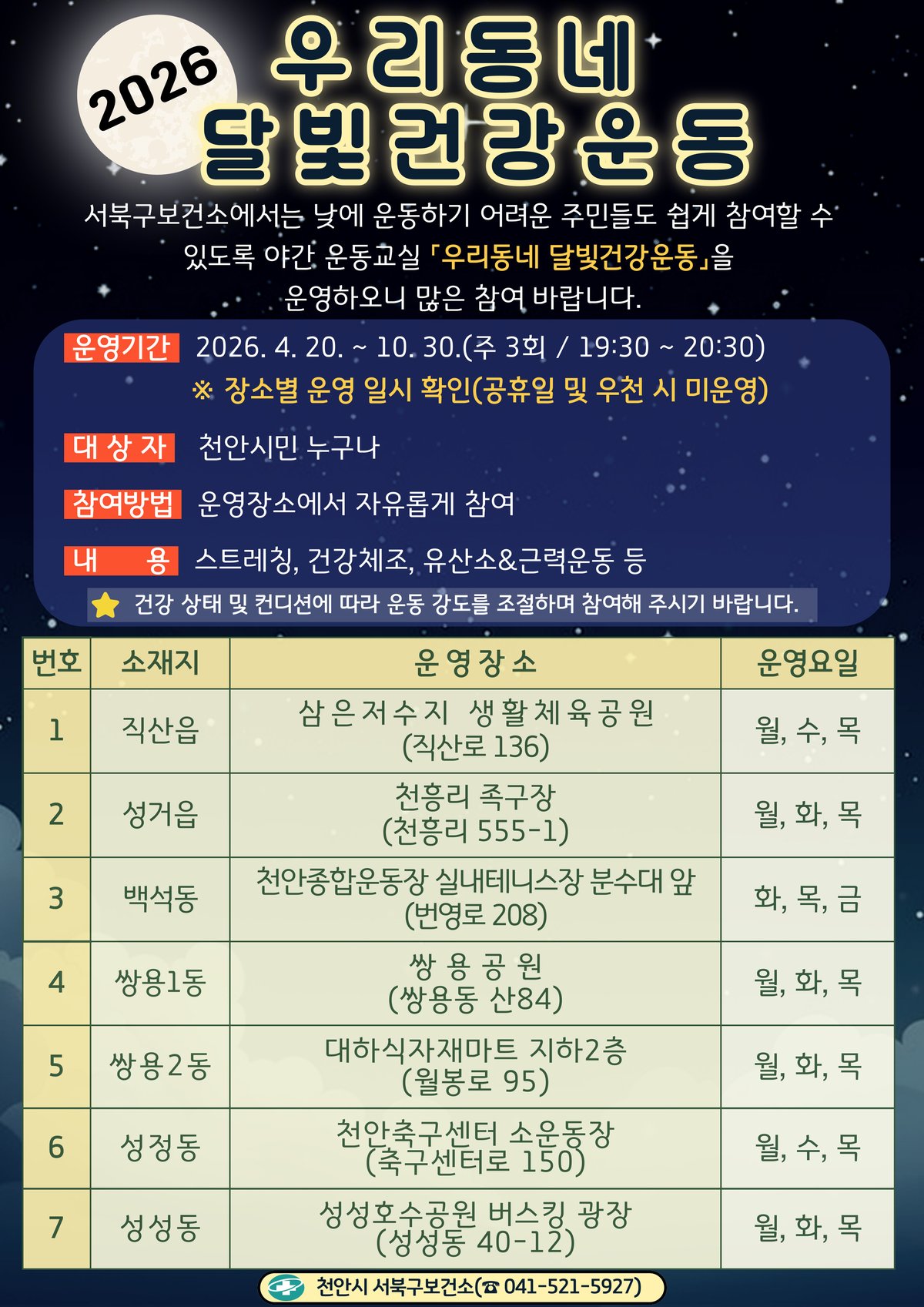 올해는 쌍용공원 등 14개소에서 주 3회 오후 7시 30분부터 오후 8시 30분까지 운영되며 전문강사가 나서 근력운동과 스트레칭 등 다양한 생활체육 활동을 진행할 예정이다.