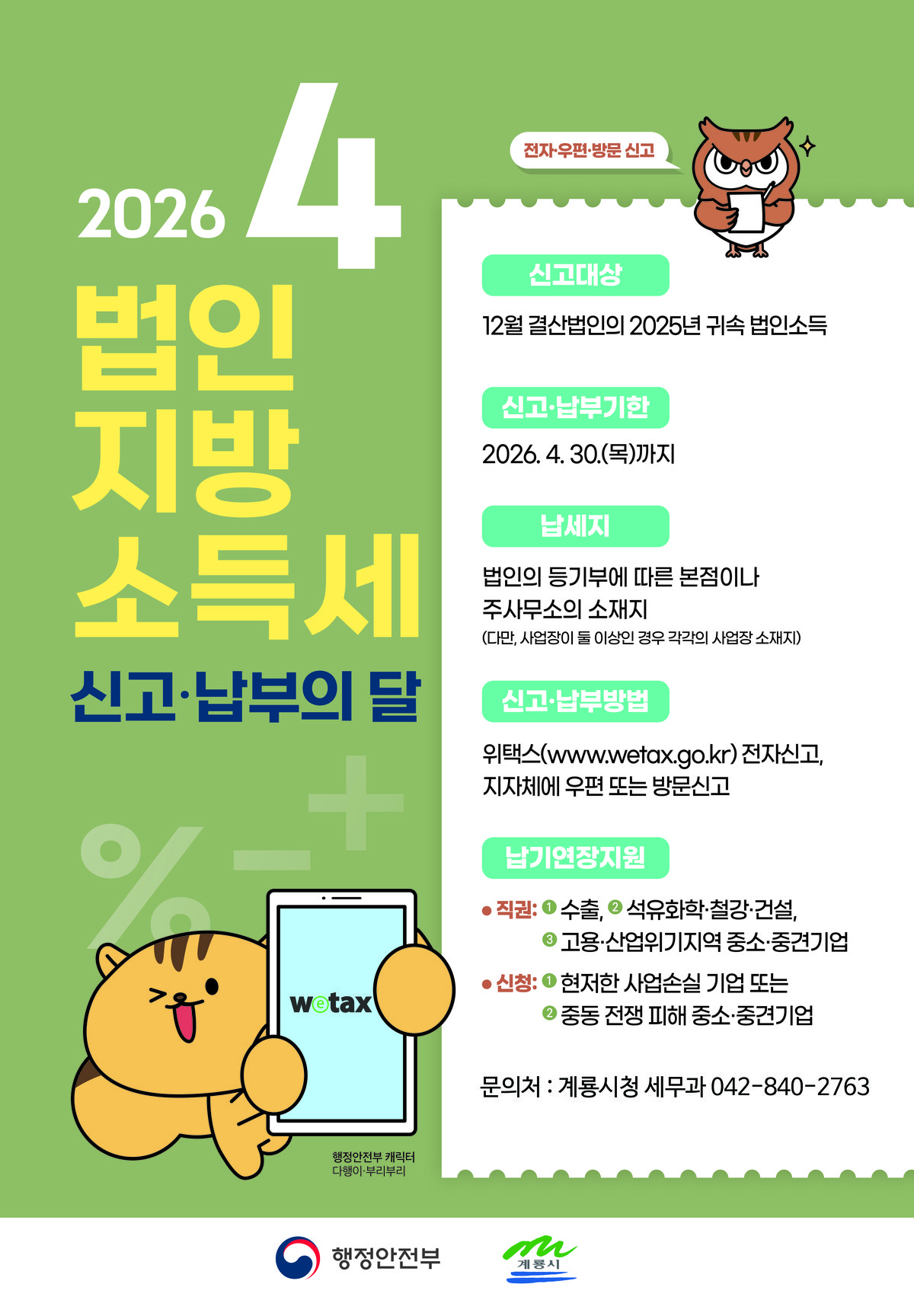 [충청중심뉴스] 충남 계룡시는 오는 4월 30일까지 ‘2025년 귀속 법인지방소득세 집중 신고 납부 기간’을 운영한다고 밝혔다.