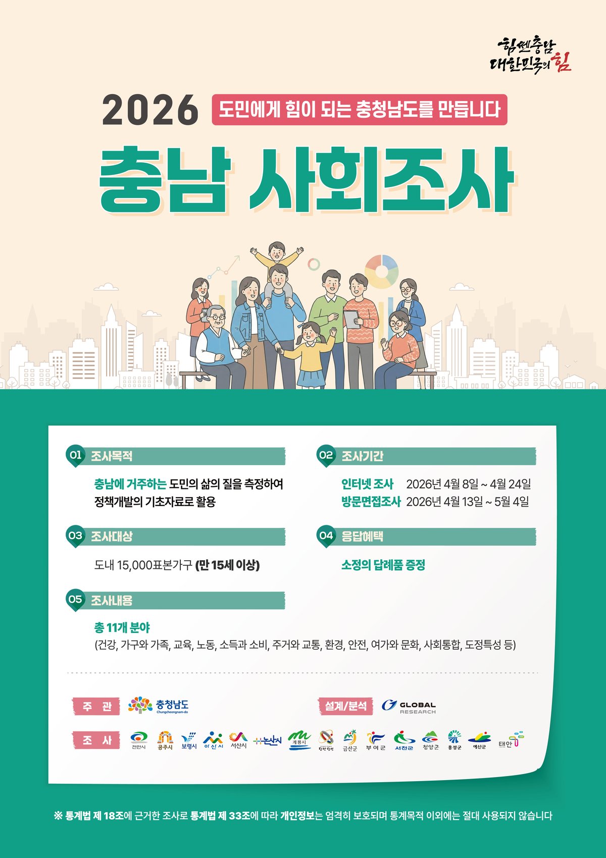 인터넷 조사는 4월 8일부터 24일까지 충청남도 사회조사 누리집에서 참여할 수 있다.