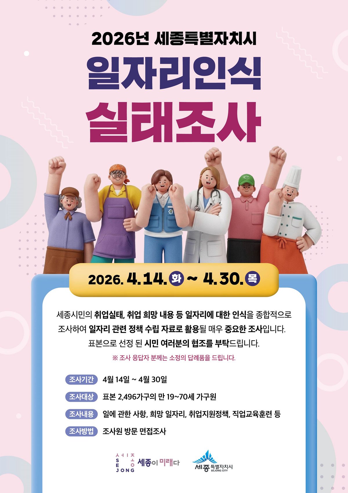 [충청중심뉴스] 세종시가 오는 14일부터 30일까지 ‘2026일자리인식실태조사’를 진행한다.