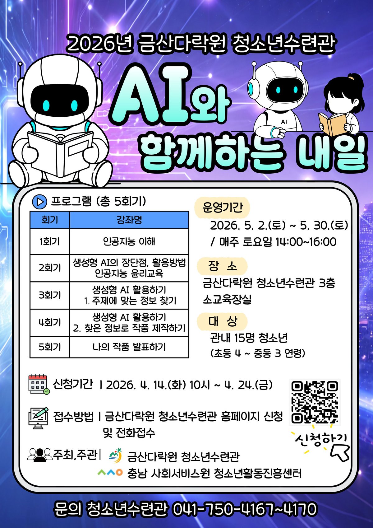 [충청중심뉴스] 금산군청소년수련관은 인공지능 체험 교육 프로그램 ‘AI와 함께하는 내일’ 참가자 15명을 4월 14일부터 24일까지 선착순 모집한다.