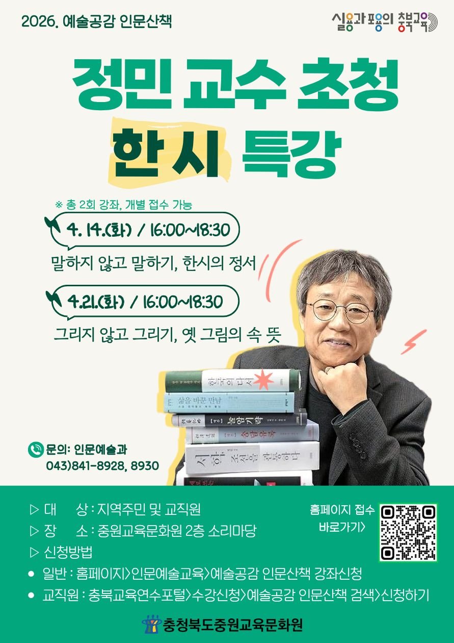 신기철 중원교육문화원장은 “예술과 인문을 아우르는 강연을 통해 지역 주민들이 삶을 깊이 성찰하고 문화적 안목을 넓히는 계기가 되길 바란다”며 “앞으로도 다양한 분야를 아우르는 인문 예술 프로그램을 지속적으로 운영하겠다”고 밝혔다.