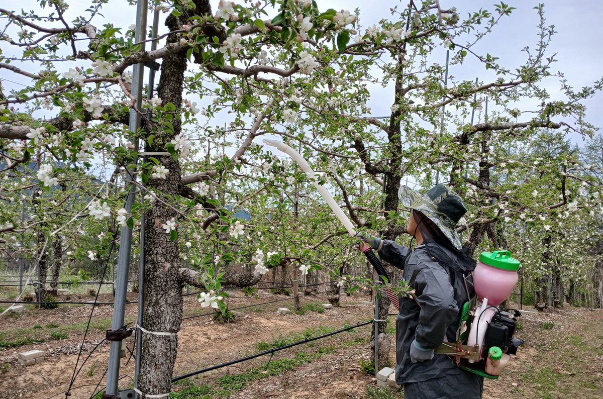 작업은 사과 꽃이 70~80% 개화한 직후, 이슬이 마른 오전 시간대에 실시하는 것이 효과적이다.