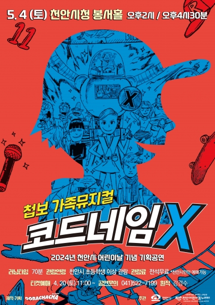 4일 시청 봉서홀에서 열리는 어린이날기념 기획공연 첩보 가족뮤지컬 ‘코드네임x’를 시작으로 5일에는 시민체육공원에서 어린이날 기념행사인 ‘오늘은 놀자 Let’s Play 천안’을 개최한다.