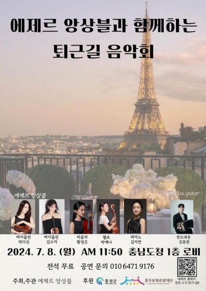 [충청중심뉴스] 홍성군이 홍주문화관광재단의 2024년도 지역문화예술지원사업의 일환으로 오는 8일 오전 11시 50분 충남도청 1층 로비에서 에제르앙상블과 함께하는 제1회 퇴근길 음악회를 개최한다.