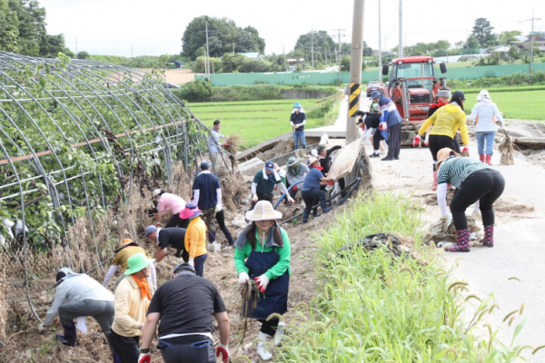 [충청중심뉴스] 민주평화통일자문회의 논산시협의회는 지난 29일 논산시 가야곡면 강청리의 배 과수농가를 찾아 비닐하우스 정비, 토사물 제거, 낙과된 배 봉지 수거 등 다양한 수해복구 작업을 실시했다.